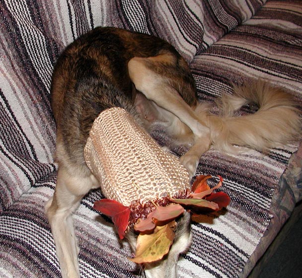 ReplyDeleteAwe, it's just Feather. She never poses for photos! Even when she'd win big at dog shows, the phots shoots were always a challenge. But she sure had fun jumping all over the couch. She's used to wearing a snood, all my salukis get snooded at mealtime anyhow. :-)